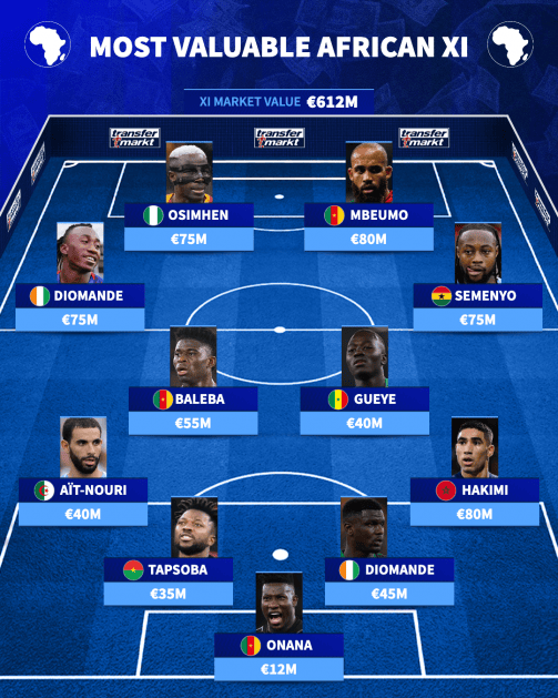 虎扑04月03日讯 德国转会市场盘点了非洲最贵阵,姆伯莫、奥斯梅恩、阿什拉夫、塞梅尼奥在列。
