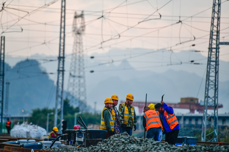 3月30日,随着最后一组联锁数据验证通过,由中铁二十局承建的贵州瓮马铁路南北延伸线首个站改工程——绿荫湖站改造工程建设顺利完成,为瓮马铁路南北延伸线建成通车奠定基础。瓮马铁路南北延伸线全长148公里,按时速120公里标准建设,是黔南州磷矿石、煤炭等多种货物集运的重要通道,也是贵州地方资源型铁路重点工程。\n 新华社记者 杨文斌 摄