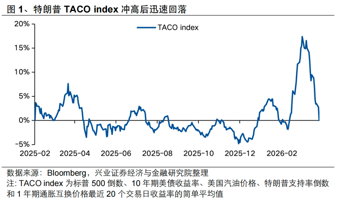 TACO指数3月底冲高触及特朗普第二任期峰值后,随4月1日特朗普全国讲话、4月7日美伊宣布停火迅速回落至低点,逼近冲突爆发前水平。在TACO指数迅速回落的背景下,特朗普在4月14号的采访中,依然表达了战争“已经结束”和“非常接近结束”的信号,这是特朗普表态和TACO指数的首次脱钩,或意味着地缘冲突的实质缓和正在发生。